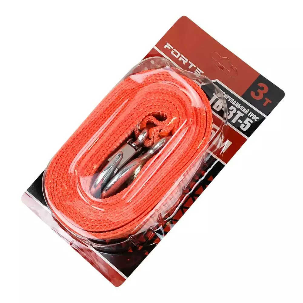 Буксирувальний трос TB-3T-5 Forte Трос буксирувальний FORTE виготовлений з первинного поліестру, на кожному кінці тросу знаходиться литий металевий гачок з пружинним фіксатором. Фабрична багатошовна прошивка забезпечує відповідність заявленому навантаженню, а якісні матеріали – надійність при експлуатації та довговічність. Необхідність в тросі може виникнути як через банальну нестачу палива в баку автомобіля, так і в разі поломки, яка унеможливлює подальше пересування на авто. Так чи інакше, але щоб дістатися до АЗС, СТО або власного гаражу, потрібен буде буксирувальний трос. Вирушаючи в дорогу, необхідно завжди перевіряти наявність в багажнику автомобіля буксирувального тросу. Адже, стаючи учасником дорожнього руху, слід піклуватися про інших водіїв так само, як і про себе (тим більше, що особисто Вам трос також може знадобитися). Переваги: Тканина стрічки виділяється своєю стійкістю до стабільних високих навантажень Металевий гачок з пружинним фіксатором Витримує високе навантаження Флуоресцентний колір робить його більш безпечним при використанні вночі