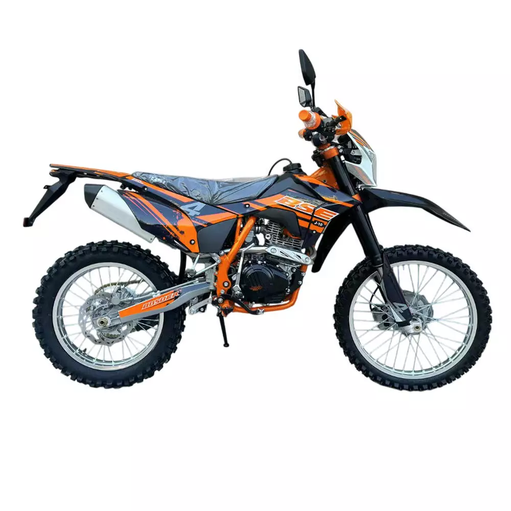 Опис Мотоцикл BSE J10 ENDURO Мотоцикл BSE J10 ENDURO розвиває максимальну швидкість 140 км/год. Модель оснащена двигуном об'ємом 250 см3 потужністю 24 л. Ергономічна підвіска MOJO обладнана важелями прогресії та повним діапазоном налаштування заднього амортизатора зробить поїзду комфортним. Запуск двигуна здійснюється за допомогою електростартера або важеля кік-стартера. Висота сидіння 910 мм, кліренс 315 мм. Дана модель радуватиме свого власника надійністю та своїми характеристиками.
