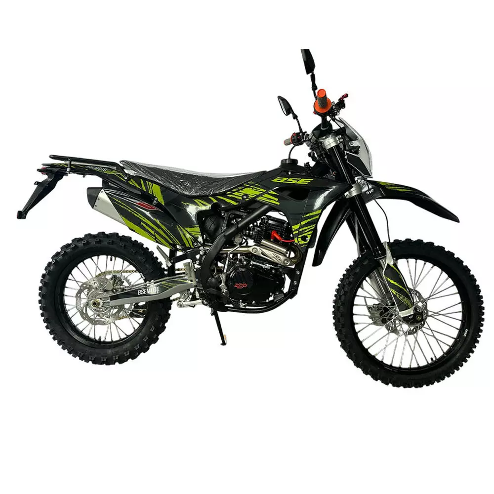 Опис Мотоцикл BSE J4 ENDURO Мотоцикл BSE J4 ENDURO розвиває максимальну швидкість 100 км / год. Модель оснащена двигуном PR300 об'ємом 270 см3 потужністю 24.5 к. с. кермо коване легкосплавне, захист рук спицеві диски, дзеркала новий дизайн спідометра та LED поворотники амортизатори з регулюванням додатковий паливний бак