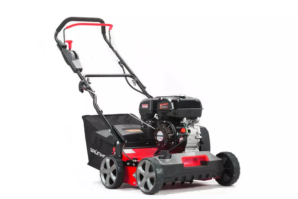 Опис Скарифікатор бензиновий Grunhelm TS-40S Скарифікатор бензиновий Grunhelm TS-40S призначений для аерації ґрунту та очищення газону від торішньої трави, моху та іншого сміття. Завдяки особливому принципу роботи техніки, коріння рослин одержує достатню кількість кисню. Трава на обробленому газоні росте особливо ефективно і набуває насичений зелений колір. Бензиновий двигун EuroV 7л.с. Вертикуттер обладнаний чотиритактним бензиновим двигуном об'ємом 212 см3. Ефективна система повітряного охолодження забезпечує оптимальну підтримку температурного режиму всіх внутрішніх компонентів. Запуск двигуна відбувається ручним способом, за допомогою шнура, намотаного на верхню частину маховика. Двигун відрізняється екологічністю, низьким рівнем шуму та вібрацій. Робочий механізм Робочий механізм системи складається з 18 сталевих ножів, які забезпечує максимальну ширину смуги захоплення 40 см і можливість занурення до 15 мм. Так як аератор може бути використаний як скарифікатор, заміна робочого елемента відбувається дуже швидко і без будь-яких труднощів. Все що необхідно зробити - замість валу-розпушувача зі сталевими ножами встановити вал-скарифікатор з пружинними зубами. Завантажувальний контейнер 45 л Скарифікатор оснащений містким завантажувальним контейнером об'ємом 45 л, завдяки якому користувач не має необхідності часто зупинятися на його спустошення. Складна рукоятка Складна конструкція ручки забезпечує зручне зберігання та транспортування на довгі відстані.