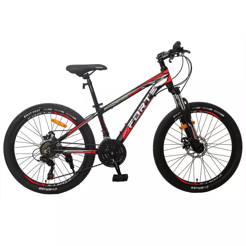 Опис Велосипед Forte Fighter 12"/24" чорно-червоний Велосипед Fighter - зручна і практична новинка від Forte. Рама велосипеда виконана з легкого та якісного алюмінію, кермо із міцної сталі. Модель створена для швидкої та комфортної їзди та принесе Вам лише позитивні емоції. Велосипед відрізняється комфортним керуванням, потужністю та стильним дизайном. Модель оснащена 21 швидкістю, передньою та задньою втулкою Legeer, механічним дисковим гальмом, а також покришками COMPASS.